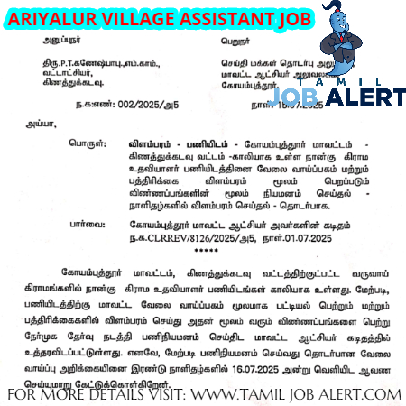 Ariyalur district village assistant recruitment 2025, Tamilnadu Revenue Department has released the recruitment notification for Village Assistant Posts. Intrested and eligble candidates can apply through the link given below. And read the article carefully. Notifications for Village Assistant employment will be published separately district-wise and circle-wise. So, depending on which district you belong to, you can get information on the official website or notice boards of that district. Additionally, information about employment news and programs can also be found on the respective district websites.